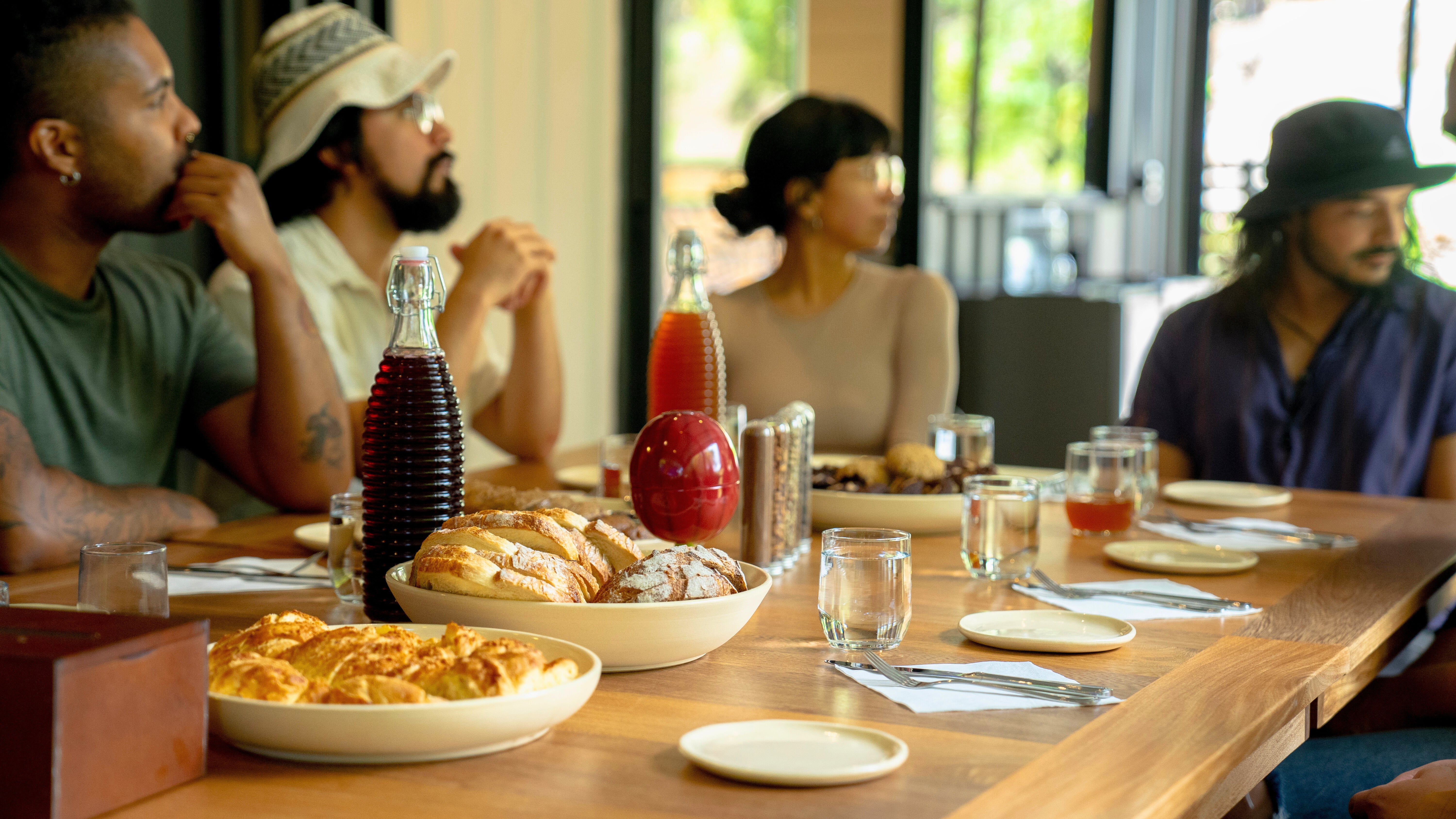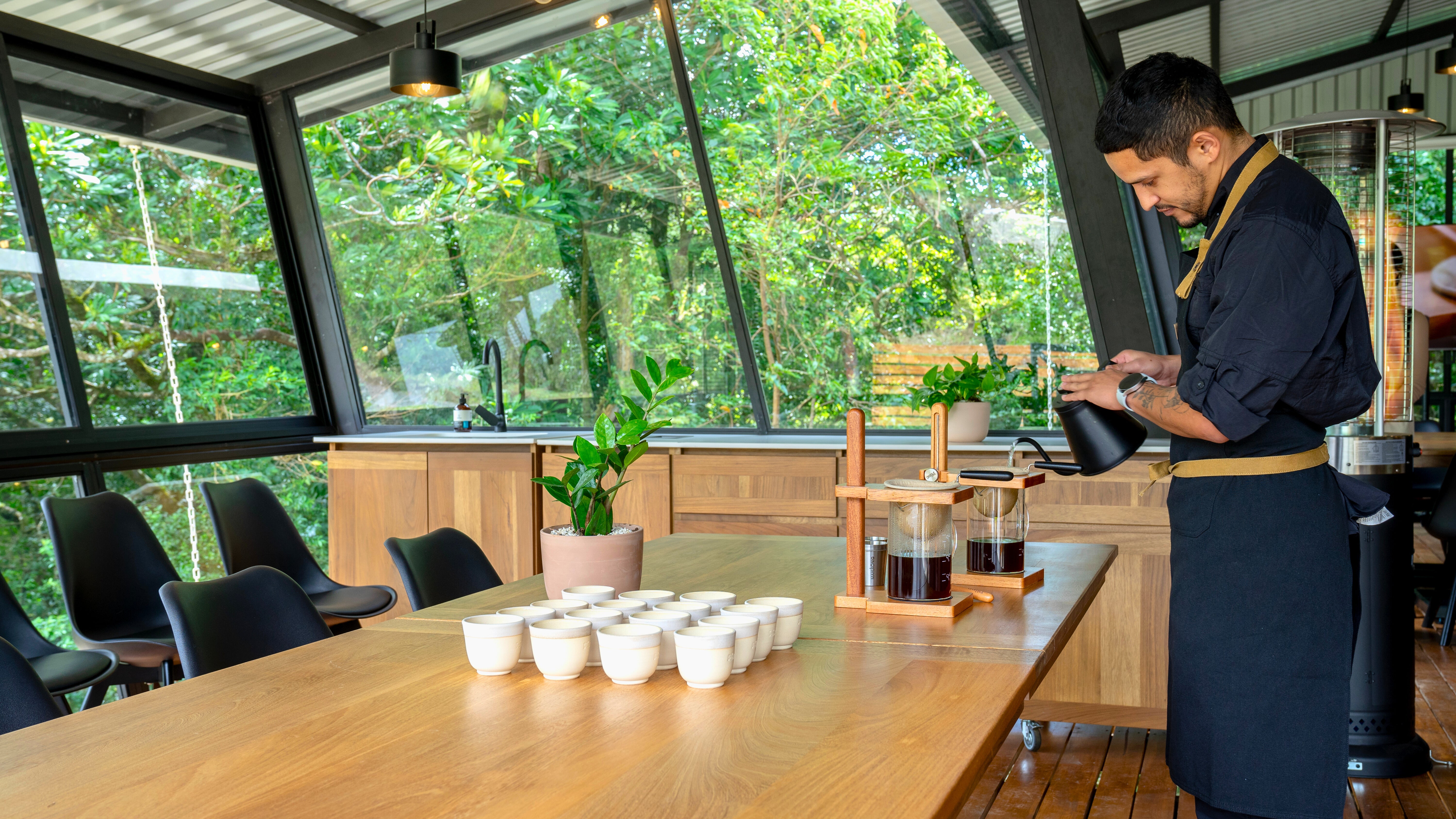Un momento para vivir el café con calma, curiosidad y cercanía: conectar con la naturaleza y saborear lo que muchas veces pasa desapercibido. Caminamos por el bosque y el cafetal; luego nos sentamos alrededor de la mesa para compartir algo de comer mientras exploramos cómo se transforma el café, y terminamos en el Coffee Lab preparando café juntos con un Plinc.